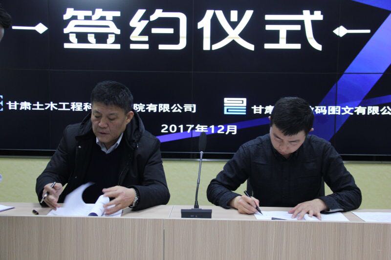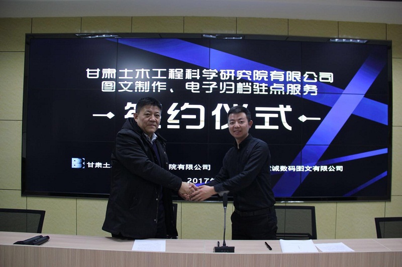 2017年12月19日鄭建軍副院長(zhǎng)與甘肅建誠(chéng)數(shù)碼圖文有限公司負(fù)責(zé)人在我公司學(xué)術(shù)報(bào)告會(huì)議廳共同簽署了《圖文制作、電子歸檔駐點(diǎn)服務(wù)》合同。