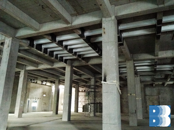 從2015年11月下旬開始,我院鋼結(jié)構(gòu)研發(fā)中心在招投標(biāo)工作結(jié)束之后,及時對施工圖深入細(xì)化,優(yōu)化施工方案,科學(xué)展開各項(xiàng)施工作業(yè)。整個項(xiàng)目的重點(diǎn)和難點(diǎn)在于對地上一、二層頂板H型鋼梁進(jìn)行加固,以及鋼梁端部原框架梁碳纖維的加固補(bǔ)強(qiáng)等方面。為此,研發(fā)中心的技術(shù)人員分別采用了鋼結(jié)構(gòu)鋼梁制作安裝、對框架梁進(jìn)行碳纖維加固等方式。