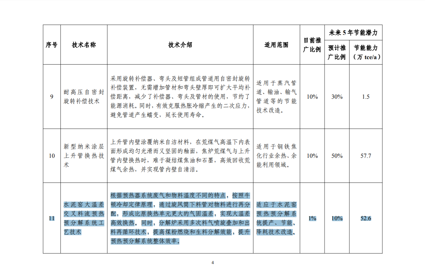 該技術(shù)適應(yīng)于水泥窯預(yù)熱預(yù)分解系統(tǒng)提產(chǎn)、節(jié)能、降耗技術(shù)改造??梢蕴岣呤炝袭a(chǎn)量 10~25%;提高熟料強(qiáng)度 1.0~3.5MPa;降低燒成煤耗 2.9~4.5kgce/t;降低綜合電耗 3.5~5.0kW·h/t;降低廢氣中 NOx含量 100~150ppm。預(yù)計(jì)未來(lái) 5 年,推廣應(yīng)用比例可達(dá)到 10%,可形成節(jié)能52.61 萬(wàn) tce/a,減排 CO2 136.79 萬(wàn) t/a。