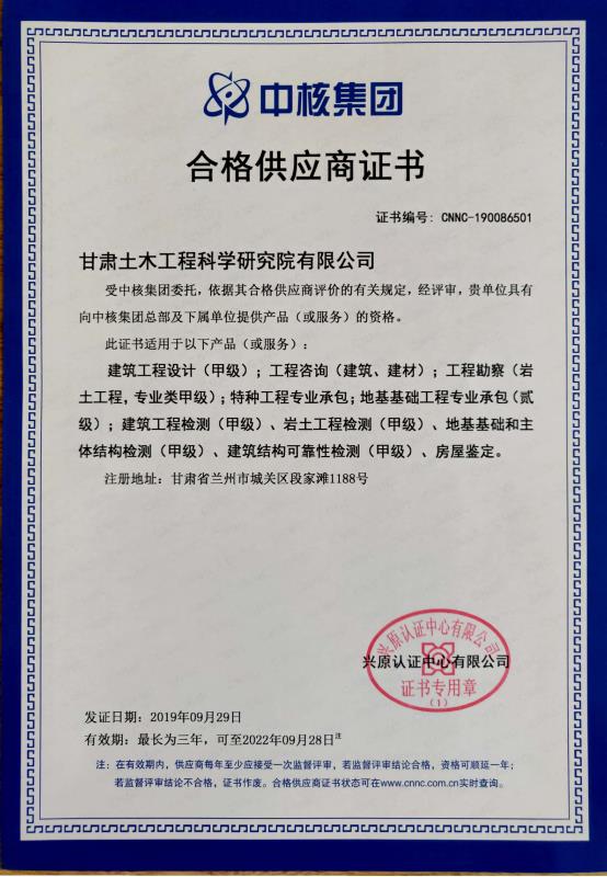 近日,公司成功通過中核集團興原認證中心有限公司和中核集團合格供應商專家委員會及管理委員會審核認證,順利獲得建筑工程設計(甲級);工程咨詢(建筑、建材);工程勘察(巖土工程,專業(yè)類甲級);特種工程專業(yè)承包;地基基礎工程專業(yè)承包(貳級);建筑工程檢測(甲級)、巖土工程檢測(甲級)、地基基礎和主體結(jié)構(gòu)檢測(甲級)、建筑結(jié)構(gòu)可靠性檢測(甲級)、房屋鑒定的合格供應商資格。
