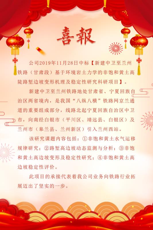 喜報(bào) 公司中標(biāo)【新建中衛(wèi)至蘭州鐵路(甘肅段)基于環(huán)境巖土力學(xué)的非飽和黃土高陡路塹邊坡變形機(jī)理及穩(wěn)定性研究科研項(xiàng)目】