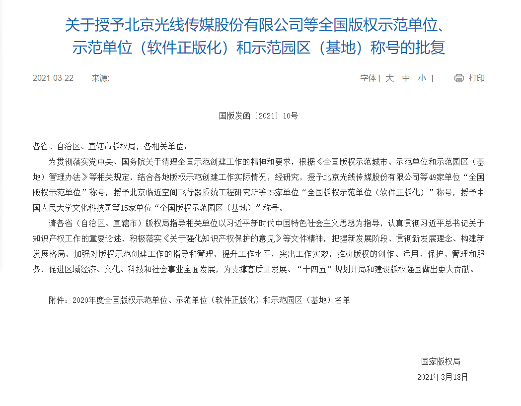2021年3月18日,國家版權局正式發(fā)文授予我公司“2020年度全國版權示范單位(軟件正版化)”榮譽稱號。全國有25家單位獲此稱號,我公司是甘肅省唯一一家獲此殊榮的單位。本次榮譽的授予,是國家版權局對認真貫徹《國家知識產(chǎn)權戰(zhàn)略綱要》,深入實施創(chuàng)新驅動發(fā)展戰(zhàn)略,強化知識產(chǎn)權創(chuàng)造、運用、保護和管理先進單位的表彰;更是對我公司全體職工在軟件正版化方面工作的肯定。