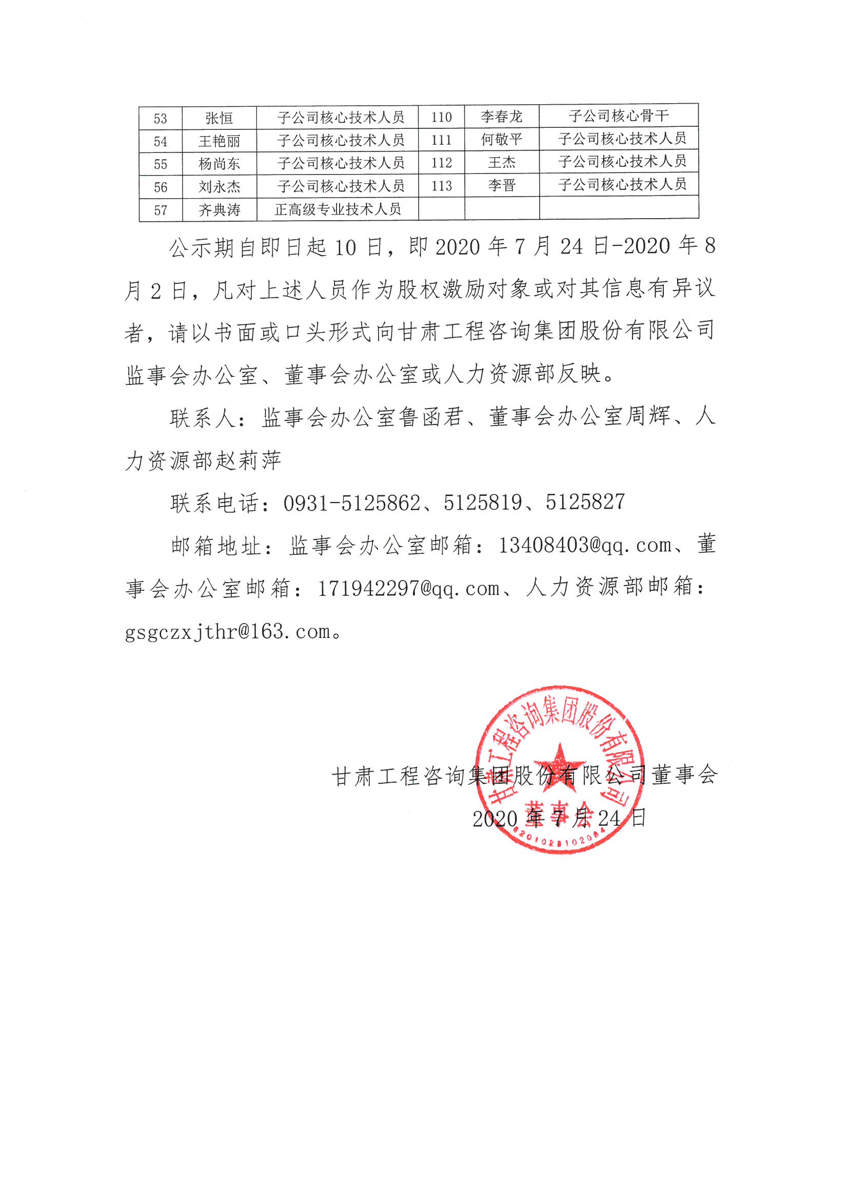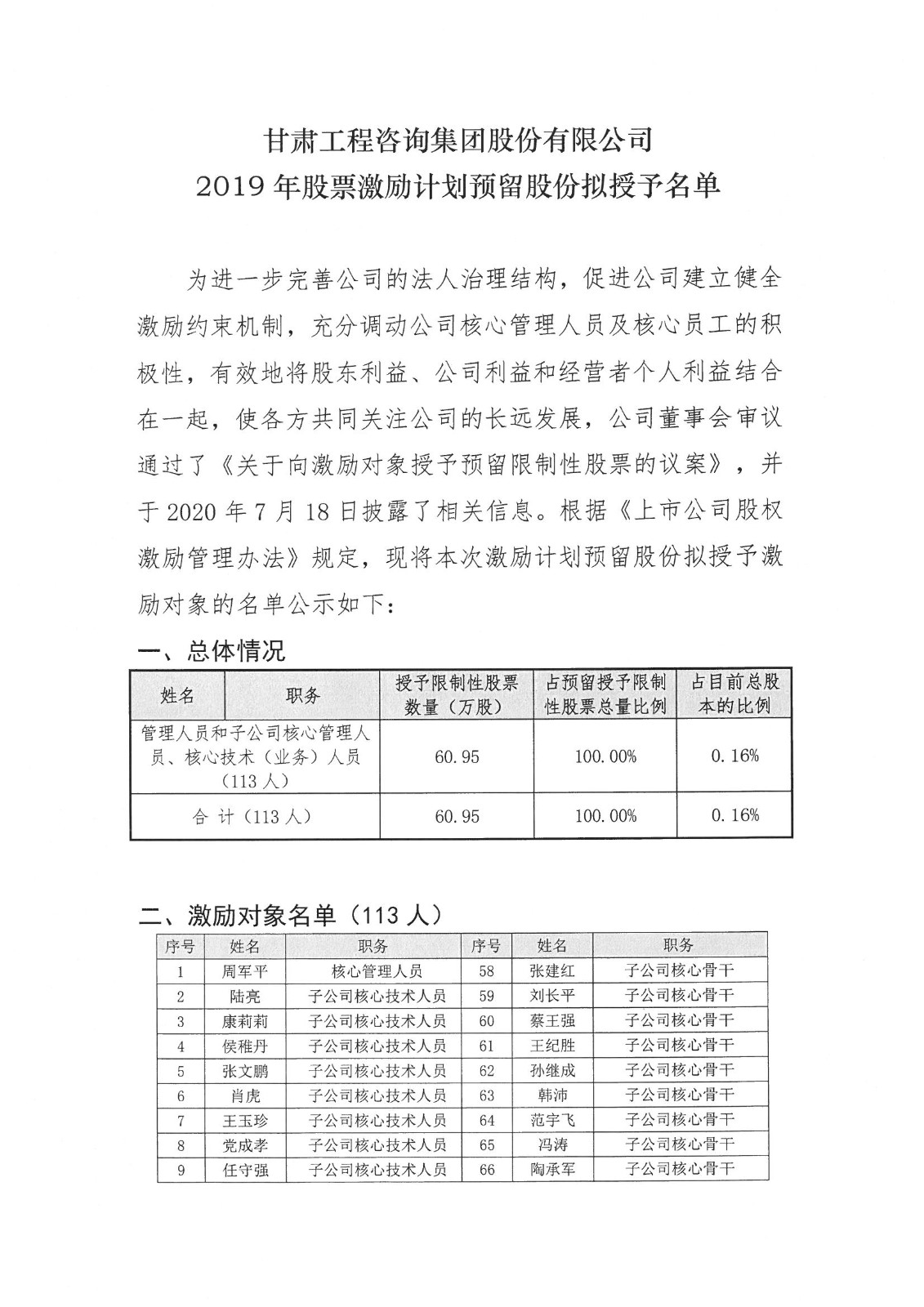 甘肅工程咨詢集團股份有限公司2019年股票激勵計劃預(yù)留股份擬授予名單