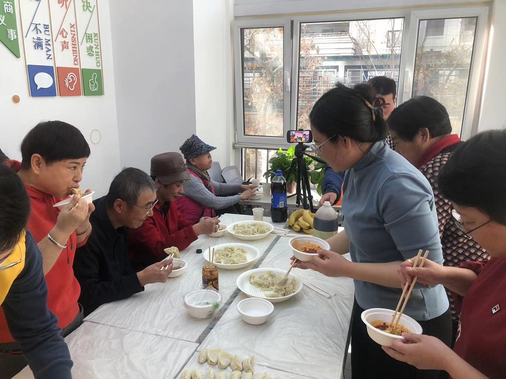 活動中,11名居民群眾、社區(qū)工作人員和集團公司志愿者們一起切菜剁餡,一起包餃子、煮餃子,忙得不亦樂乎。當(dāng)熱騰騰的餃子端上桌,大家圍桌而坐,共享香噴噴的餃子,感受著濃厚的節(jié)日氛圍。