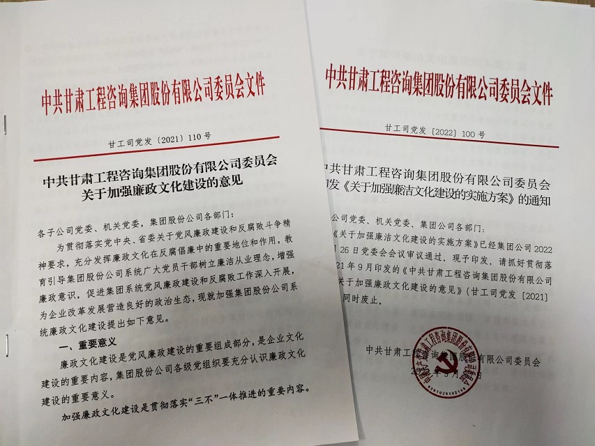 作為新組建的產(chǎn)業(yè)集團,甘肅工程咨詢集團把資產(chǎn)整合、產(chǎn)業(yè)耦合和文化融合作為集團公司組建的重要內容,其中讓廉潔文化建設在企業(yè)文化建設中先行一步,早安排早部署,2021年9月集團公司黨委研究印發(fā)《關于加強廉政文化建設的意見》,在中共中央辦公廳《關于加強新時代廉潔文化建設的意見》和省委《實施方案》印發(fā)后,又及時對標、查缺補漏,2022年9月修訂印發(fā)《關于加強廉潔文化建設的實施方案》,為新時代集團公司加強廉潔文化建設提供了指導。自組建以來,集團公司廉潔文化建設力求在“內化于心”上下功夫,在“外化于行”上求實效,引導干部職工廉潔從業(yè),廉潔用權,積極營造“崇廉、尚廉、倡廉、守廉”的企業(yè)風尚和發(fā)展氛圍。