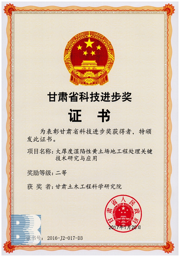 《大厚度濕陷性黃土場地工程處理關(guān)鍵技術(shù)研究與應(yīng)用》(2016年度甘肅省科技進(jìn)步二等獎(jiǎng))