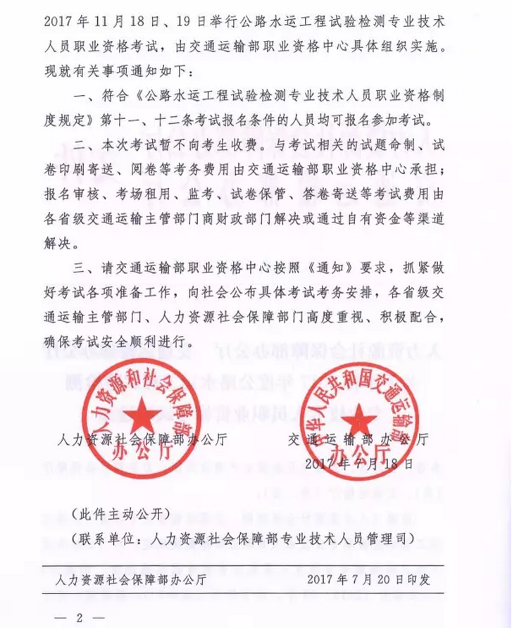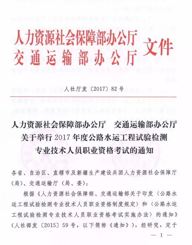 人力資源社會保障部辦公廳 交通運(yùn)輸部辦公廳關(guān)于舉辦2017年度公路水運(yùn)工程試驗(yàn)檢測專業(yè)技術(shù)人員職業(yè)資格考試的通知